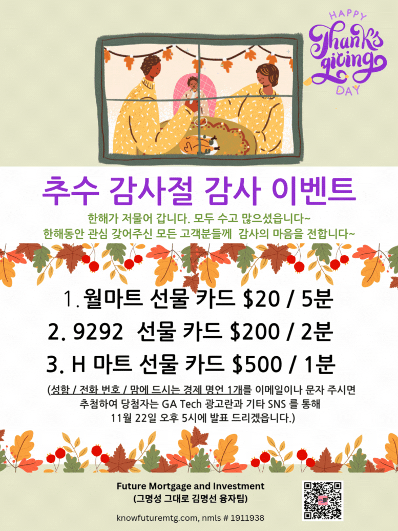 추수 감사절 감사 이벤트 (한해동안 관심 갖어주신 모든 고객분들께 감사의 마음을 전합니다~) 문자나 이메일로 신청하실 수 있읍니다 (성함, 전화번호, 아래 경제 명언 200개중에서 맘에 드시는 경제 명언 1개를 적어 주시면 됩니다. 문자: 770-242-3413 이메일: ask@knowfuturemtg.com Future Mortgage and Investment (그명성 그대로, 김명선 융자팀) ask@knowfuturemtg.com 770-242-3413 (Text first and Call) 770-679-8595 (Fax) 800-590-8580 (Text or Call) 돈을 벌기 위해서는 많은 것을 해야 하지만, 돈을 잃기 위해서는 아무것도 하지 않아도 됩니다. (빌리 그레이엄) https://www.youtube.com/watch?v=k8qvMk7znDY&list=PLwn_yFTCjWMUHPpnIRILgTvufURYBx_Xl&index=121 환기 사항 : 융자나 기타 서비스를 요청하지 않으며 누구나 무료로 신청하실 수 있읍니다. 개인정보는 절대적으로 보호되며, 선물 증정 추첨목적으로만 사용됩니다. 추첨 등록 마감일: 11월 21일 오후 11시 59분 (동부 시간)