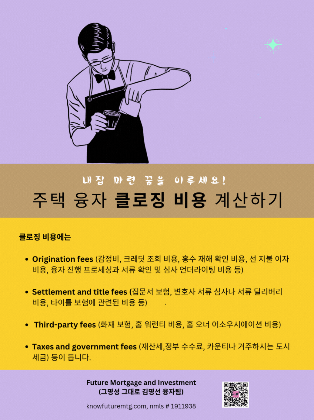 나도 주택 융자 받을 수 있을까요? 직접 확인해 보시고, 나에게 가능한 융자를 차곡차곡 준비해 보셔요~ 지금 당장 연락 주세요! 자세히 보러가기 (클릭하셔요): https://www.knowfuturemtg.com/landing-page2236c01c Future Mortgage and Investment (그명성 그대로, 김명선 융자팀) NMLS #1911938 ask@knowfuturemtg.com 770-242-3413 (Text first and Call) 770-679-8595 (Fax) 800-590-8580 (Text or Call) 주의 사항 1 : 융자는 돈 (신용)이고 돈 (신용) 은 빚입니다. 융자를 잘 활용하면 자산 증식이나 경제 생활에 큰 이익을 주지만, 그렇지 못할 경우, 집을 잃거나 경제적인 파국의 원인이 될 수 있읍니다. 육체적인 고통이나 정신적인 고통은 911을 누르시고, 채무로 인한 경제적인 고통은 CFPB, Financial Counselor 혹은 가까 운 융자 전문가에게 문의하셔요. 주의 사항 2: • 이 제안은 특정 대출 조건 및 자격 요건을 충족하는 고객에게만 해당됩니다. • 명시된 승인 시간 및 자금 수령 기간은 모든 경우에 적용되는 것은 아니며, 대출 금액, 지역, 서류 준비 상태 및 기타 조건에 따라 달라질 수 있습니다. • 모든 대출은 최종 심사 및 승인 절차를 거쳐서 최종 융자 승인이나 융자 거부가 될 수 있읍니다. • 모든 이자율 및 수수료와 페이먼트는 시장 상황에 따라 변동될 수 있으며, 최종 이자율은 융자 신청이후 Lock 시점에 결정됩니다. 주의사항 3: 추수 감사절과 크리스마스 연말연휴로 인해서 융자 진행이 개인과 상황에 따라서 지연될 수 있읍니 다. 모델: AI 도우미, 소피아 978-788-1544 ( 24시간, 365일 통화 가능합니다)