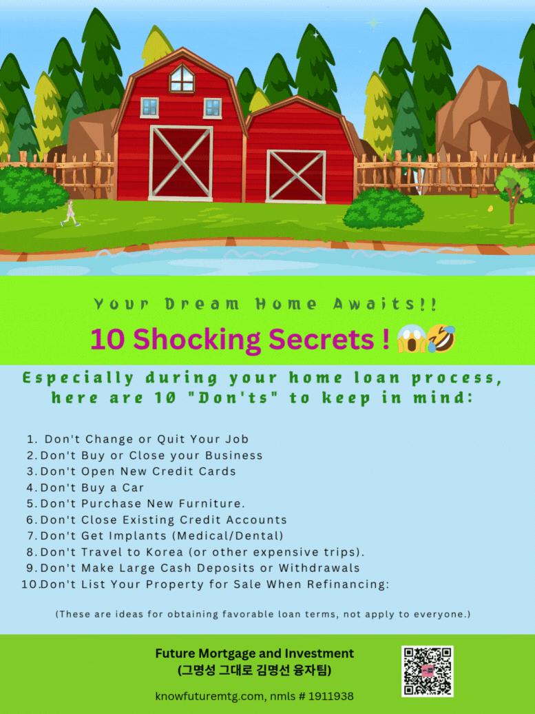 주택 융자, 무심코 한 행동이 천국과 지옥을 가른다?! 집을 사는 설렘, 재융자의 기대감… 하지만 작은 실수 하나가 모든 것을 뒤엎을 수 있습니다. 특히 주택 융자 진행 중이라면, 아래 10가지 '금기 사항'을 반드시 기억하세요! • 직장을 바꾸거나 그만두지 마세요. • 사업체를 팔거나 문 닫지 마세요. • 새로운 신용카드 발급받지 마세요. • 새 차를 구입하지 마세요. • 새 가구를 구입하지 마세요. • 기존 신용 계좌를 해지하지 마세요. • 무리한 시술(예: 임플란트)을 받지 마세요. • 장기간 해외여행(예: 한국 여행)은 피하세요. • 거액의 현금 인출이나 입금을 하지 마세요. • 재융자시 부동산을 동시에 시장에 내놓지 마세요. 이 작은 주의사항들이 여러분의 주택 융자를 성공적으로 이끄는 열쇠입니다. 혹시 궁금한 점이 있으시다면 언제든지 문의해주세요! ❤❣💟💛💌💯 https://www.knowfuturemtg.com/landing-page2236c01c ❤❣💟💛💌💯 Future Mortgage and Investment (그명성 그대로, 김명선 융자팀) ask@knowfuturemtg.com 770-242-3413 (Text first and Call) 770-679-8595 (Fax) 800-590-8580 (Text or Call) ❤❣💟💛💌💯 주의 사항: 융자는 돈 (신용)이고 돈 (신용) 은 빚입니다. 융자를 잘 활용하면 자산 증식이나 경제 생활에 큰 이익을 주지만, 그렇지 못할 경우, 집을 잃거나 경제적인 파국의 원인이 될수 있읍니다. 육체적인 고통이나 정신적인 고통은 911을 누르시고, 채무로 인한 경제적인 고통은 CFPB, Financial Counselor 혹은 가까운 융자 전문가에게 문의 하셔요.