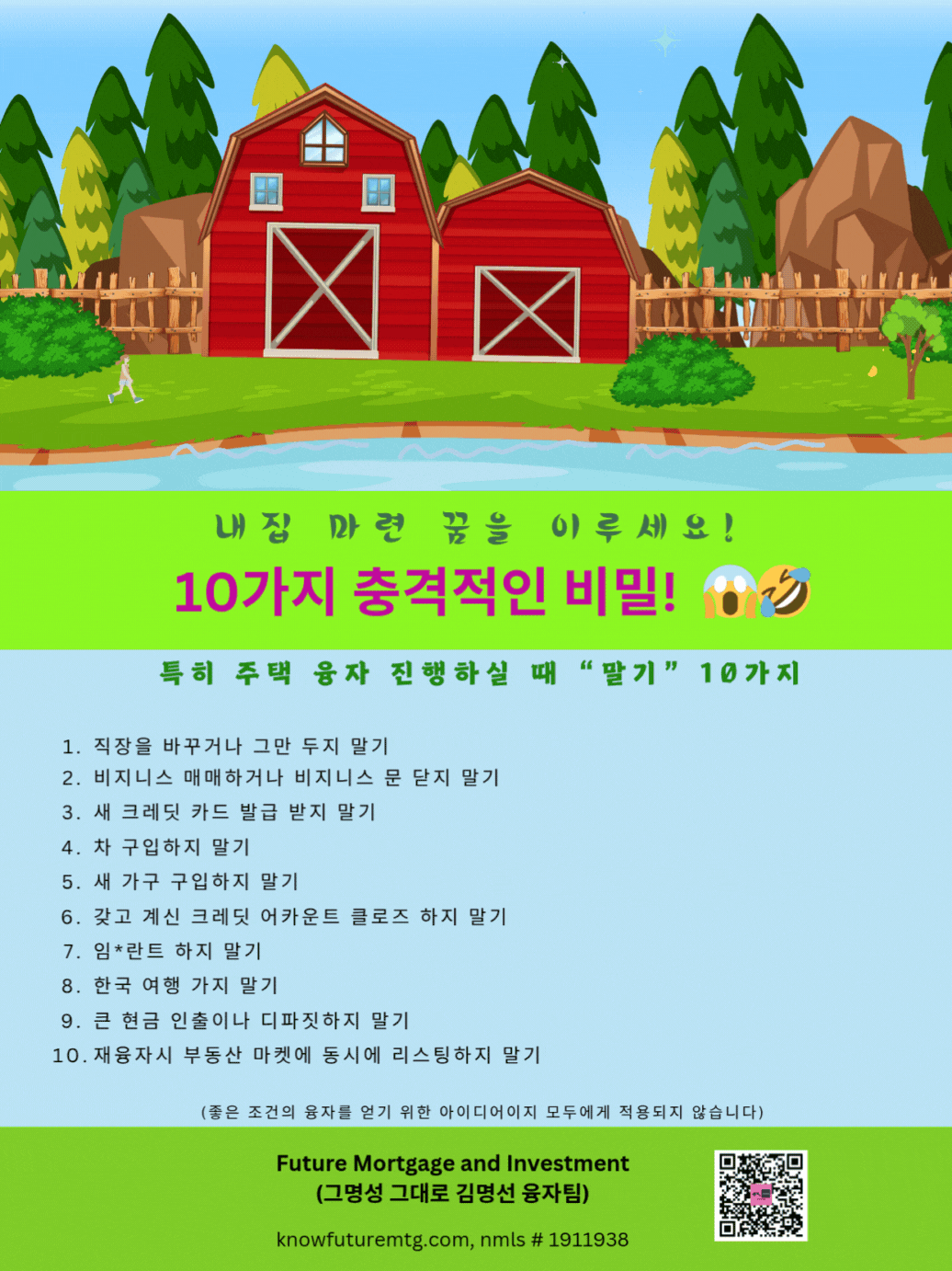 나도 주택 융자 받을 수 있을까요? 직접 확인해 보시고, 나에게 가능한 융자를 차곡차곡 준비해 보셔요~ 지금 당장 연락 주세요! 자세히 보러가기 (클릭하셔요): https://www.knowfuturemtg.com/landing-page2236c01c Future Mortgage and Investment (그명성 그대로, 김명선 융자팀) NMLS #1911938 ask@knowfuturemtg.com 770-242-3413 (Text first and Call) 770-679-8595 (Fax) 800-590-8580 (Text or Call) 주의 사항 1 : 융자는 돈 (신용)이고 돈 (신용) 은 빚입니다. 융자를 잘 활용하면 자산 증식이나 경제 생활에 큰 이익을 주지만, 그렇지 못할 경우, 집을 잃거나 경제적인 파국의 원인이 될 수 있읍니다. 육체적인 고통이나 정신적인 고통은 911을 누르시고, 채무로 인한 경제적인 고통은 CFPB, Financial Counselor 혹은 가까 운 융자 전문가에게 문의하셔요. 주의 사항 2: • 이 제안은 특정 대출 조건 및 자격 요건을 충족하는 고객에게만 해당됩니다. • 명시된 승인 시간 및 자금 수령 기간은 모든 경우에 적용되는 것은 아니며, 대출 금액, 지역, 서류 준비 상태 및 기타 조건에 따라 달라질 수 있습니다. • 모든 대출은 최종 심사 및 승인 절차를 거쳐서 최종 융자 승인이나 융자 거부가 될 수 있읍니다. • 모든 이자율 및 수수료와 페이먼트는 시장 상황에 따라 변동될 수 있으며, 최종 이자율은 융자 신청이후 Lock 시점에 결정됩니다. 주의사항 3: 추수 감사절과 크리스마스 연말연휴로 인해서 융자 진행이 개인과 상황에 따라서 지연될 수 있읍니 다. 모델: AI 도우미, 소피아 978-788-1544 ( 24시간, 365일 통화 가능합니다)