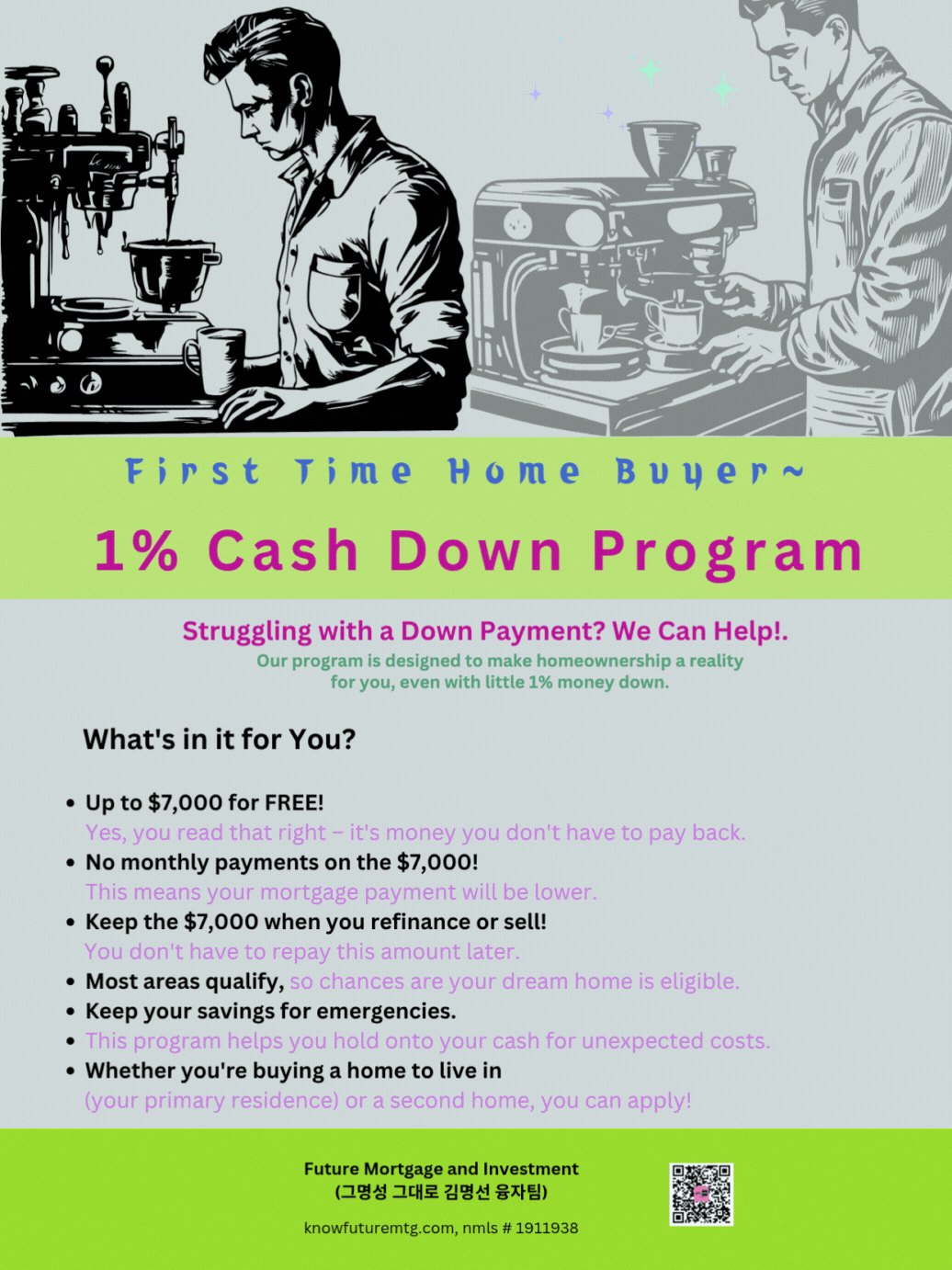 나도 주택 융자 받을 수 있을까요? 직접 확인해 보시고, 나에게 가능한 융자를 차곡차곡 준비해 보셔요~ 지금 당장 연락 주세요! 자세히 보러가기 (클릭하셔요): https://www.knowfuturemtg.com/landing-page2236c01c Future Mortgage and Investment (그명성 그대로, 김명선 융자팀) NMLS #1911938 ask@knowfuturemtg.com 770-242-3413 (Text first and Call) 770-679-8595 (Fax) 800-590-8580 (Text or Call) 주의 사항 1 : 융자는 돈 (신용)이고 돈 (신용) 은 빚입니다. 융자를 잘 활용하면 자산 증식이나 경제 생활에 큰 이익을 주지만, 그렇지 못할 경우, 집을 잃거나 경제적인 파국의 원인이 될 수 있읍니다. 육체적인 고통이나 정신적인 고통은 911을 누르시고, 채무로 인한 경제적인 고통은 CFPB, Financial Counselor 혹은 가까 운 융자 전문가에게 문의하셔요. 주의 사항 2: • 이 제안은 특정 대출 조건 및 자격 요건을 충족하는 고객에게만 해당됩니다. • 명시된 승인 시간 및 자금 수령 기간은 모든 경우에 적용되는 것은 아니며, 대출 금액, 지역, 서류 준비 상태 및 기타 조건에 따라 달라질 수 있습니다. • 모든 대출은 최종 심사 및 승인 절차를 거쳐서 최종 융자 승인이나 융자 거부가 될 수 있읍니다. • 모든 이자율 및 수수료와 페이먼트는 시장 상황에 따라 변동될 수 있으며, 최종 이자율은 융자 신청이후 Lock 시점에 결정됩니다. 주의사항 3: 추수 감사절과 크리스마스 연말연휴로 인해서 융자 진행이 개인과 상황에 따라서 지연될 수 있읍니 다. 모델: AI 도우미, 소피아 978-788-1544 ( 24시간, 365일 통화 가능합니다)