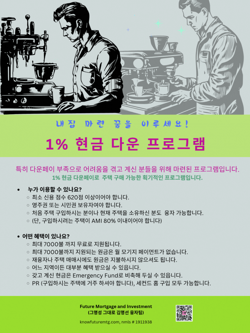 1%만 다운하시고 최고 $7,000까지 무료로 다운 페이먼트 보조해 드립니다.