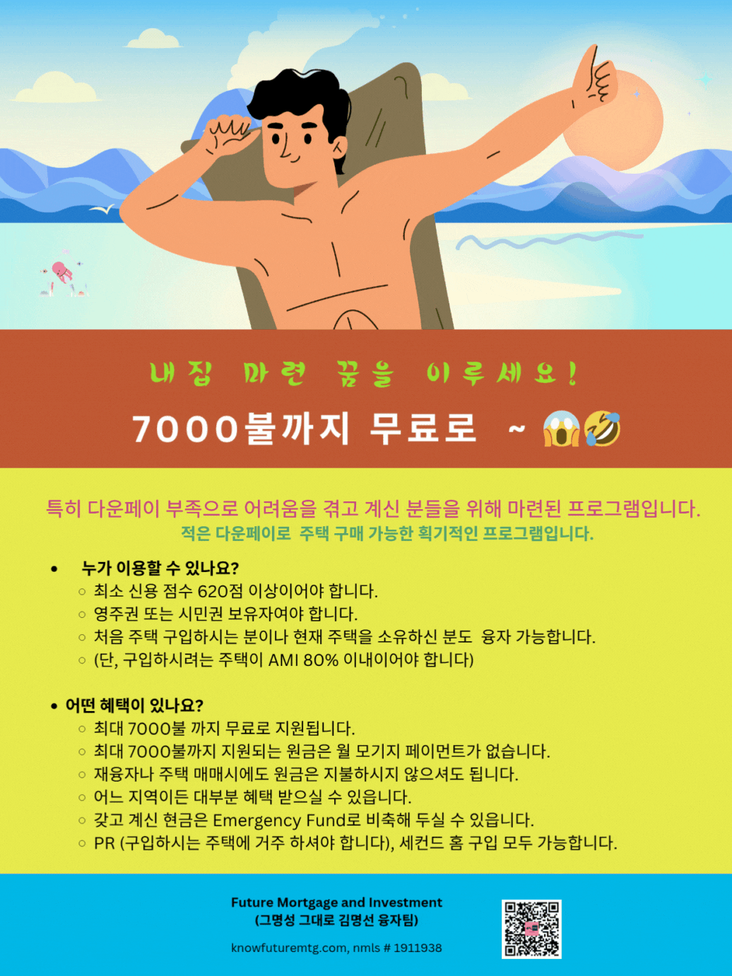 1%만 다운하시고 최고 $7,000까지 무료로 다운 페이먼트 보조해 드립니다.