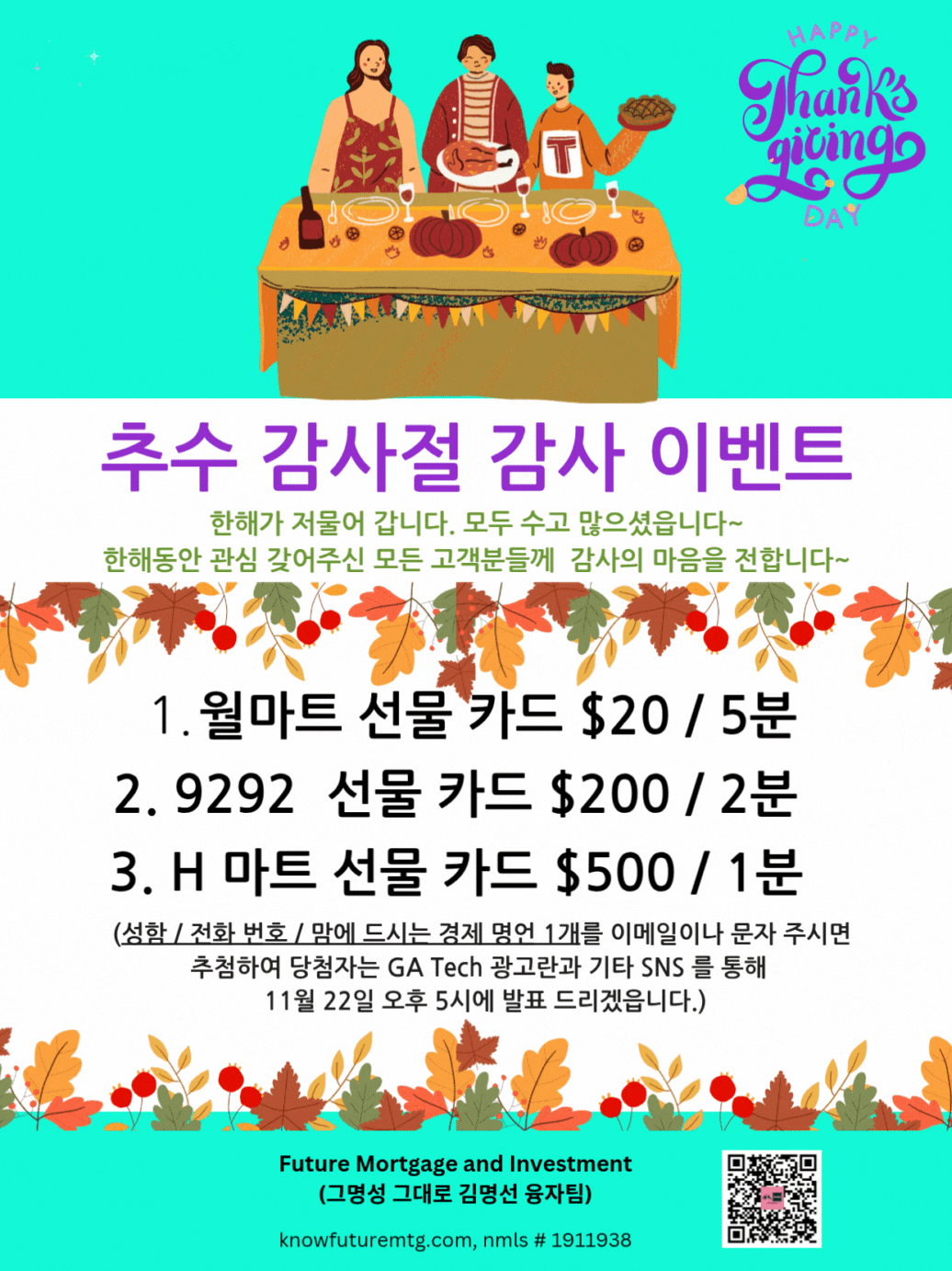 추수 감사절 감사 이벤트 (한해동안 관심 갖어주신 모든 고객분들께 감사의 마음을 전합니다~) 문자나 이메일로 신청하실 수 있읍니다 (성함, 전화번호, 아래 경제 명언 200개중에서 맘에 드시는 경제 명언 1개를 적어 주시면 됩니다. 문자: 770-242-3413 이메일: ask@knowfuturemtg.com Future Mortgage and Investment (그명성 그대로, 김명선 융자팀) ask@knowfuturemtg.com 770-242-3413 (Text first and Call) 770-679-8595 (Fax) 800-590-8580 (Text or Call) 돈을 벌기 위해서는 많은 것을 해야 하지만, 돈을 잃기 위해서는 아무것도 하지 않아도 됩니다. (빌리 그레이엄) https://www.youtube.com/watch?v=k8qvMk7znDY&list=PLwn_yFTCjWMUHPpnIRILgTvufURYBx_Xl&index=121 환기 사항 : 융자나 기타 서비스를 요청하지 않으며 누구나 무료로 신청하실 수 있읍니다. 개인정보는 절대적으로 보호되며, 선물 증정 추첨목적으로만 사용됩니다. 추첨 등록 마감일: 11월 21일 오후 11시 59분 (동부 시간)