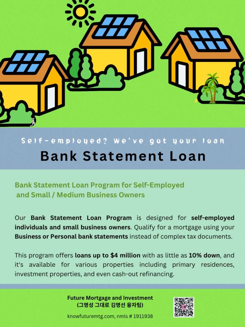 ❤❣💟💛💌💯 수입 증명 없이 주택 구입 가능할까요? 더 많은 투자용 부동산을 구입하고 싶으신가요? ❤❣💟💛💌💯 지금이 바로 현재 갖고 계신 자산목록 (포트폴리오)를 확장하실 기회입니다. 투자용 주택 융자 신청하기 (클릭하셔요~) ❤❣💟💛💌💯 Future Mortgage and Investment (그명성 그대로, 김명선 융자팀) ask@knowfuturemtg.com 770-242-3413 (Text first and Call) 770-679-8595 (Fax) 800-590-8580 (Text or Call) ❤❣💟💛💌💯 주의 1: • 이 제안은 특정 대출 조건 및 자격 요건을 충족하는 고객에게만 해당됩니다. • 명시된 승인 시간 및 자금 수령 기간은 모든 경우에 적용되는 것은 아니며, 대출 금액, 지역, 서류 준비 상태 및 기타 조건에 따라 달라질 수 있습니다. • 모든 대출은 최종 심사 및 승인 절차를 거쳐야 합니다. • 모든 이자율 및 수수료는 시장 상황에 따라 변동될 수 있으며, 최종 금리는 신청 시점에 결정됩니다. 주의2: Information is subject to change. Certain restrictions apply. Subject to borrower approval. Not applicable in West Virginia. Not available on Texas 50(a)(6). 주의 3: 융자는 돈 (신용)이고 돈 (신용) 은 빚입니다. 융자를 잘 활용하면 자산 증식이나 경제 생활에 큰 이익을 주지만, 그렇지 못할 경우, 집을 잃거나 경제적인 파국의 원인이 될 수 있읍니다. 육체적인 고통이나 정신적인 고통은 911을 누르시고, 채무로 인한 경제적인 고통은 CFPB, Financial Counselor 혹은 가까운 융자 전문가에게 문의하셔요.