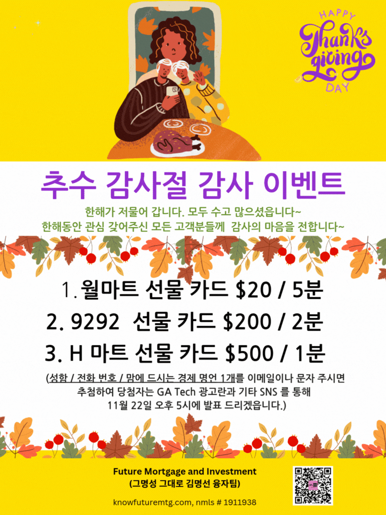 추수 감사절 감사 이벤트 (한해동안 관심 갖어주신 모든 고객분들께 감사의 마음을 전합니다~) 문자나 이메일로 신청하실 수 있읍니다 (성함, 전화번호, 아래 경제 명언 200개중에서 맘에 드시는 경제 명언 1개를 적어 주시면 됩니다. 문자: 770-242-3413 이메일: ask@knowfuturemtg.com Future Mortgage and Investment (그명성 그대로, 김명선 융자팀) ask@knowfuturemtg.com 770-242-3413 (Text first and Call) 770-679-8595 (Fax) 800-590-8580 (Text or Call) 돈을 벌기 위해서는 많은 것을 해야 하지만, 돈을 잃기 위해서는 아무것도 하지 않아도 됩니다. (빌리 그레이엄) https://www.youtube.com/watch?v=k8qvMk7znDY&list=PLwn_yFTCjWMUHPpnIRILgTvufURYBx_Xl&index=121 환기 사항 : 융자나 기타 서비스를 요청하지 않으며 누구나 무료로 신청하실 수 있읍니다. 개인정보는 절대적으로 보호되며, 선물 증정 추첨목적으로만 사용됩니다. 추첨 등록 마감일: 11월 21일 오후 11시 59분 (동부 시간)