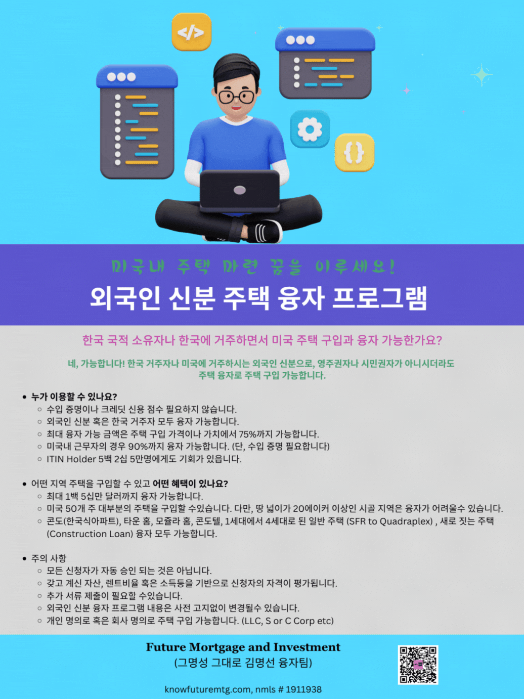 ❤❣💟💛💌💯 수입 증명 없이 주택 구입 가능할까요? 더 많은 투자용 부동산을 구입하고 싶으신가요? ❤❣💟💛💌💯 지금이 바로 현재 갖고 계신 자산목록 (포트폴리오)를 확장하실 기회입니다. 투자용 주택 융자 신청하기 (클릭하셔요~) ❤❣💟💛💌💯 Future Mortgage and Investment (그명성 그대로, 김명선 융자팀) ask@knowfuturemtg.com 770-242-3413 (Text first and Call) 770-679-8595 (Fax) 800-590-8580 (Text or Call) ❤❣💟💛💌💯 주의 1: • 이 제안은 특정 대출 조건 및 자격 요건을 충족하는 고객에게만 해당됩니다. • 명시된 승인 시간 및 자금 수령 기간은 모든 경우에 적용되는 것은 아니며, 대출 금액, 지역, 서류 준비 상태 및 기타 조건에 따라 달라질 수 있습니다. • 모든 대출은 최종 심사 및 승인 절차를 거쳐야 합니다. • 모든 이자율 및 수수료는 시장 상황에 따라 변동될 수 있으며, 최종 금리는 신청 시점에 결정됩니다. 주의2: Information is subject to change. Certain restrictions apply. Subject to borrower approval. Not applicable in West Virginia. Not available on Texas 50(a)(6). 주의 3: 융자는 돈 (신용)이고 돈 (신용) 은 빚입니다. 융자를 잘 활용하면 자산 증식이나 경제 생활에 큰 이익을 주지만, 그렇지 못할 경우, 집을 잃거나 경제적인 파국의 원인이 될 수 있읍니다. 육체적인 고통이나 정신적인 고통은 911을 누르시고, 채무로 인한 경제적인 고통은 CFPB, Financial Counselor 혹은 가까운 융자 전문가에게 문의하셔요.