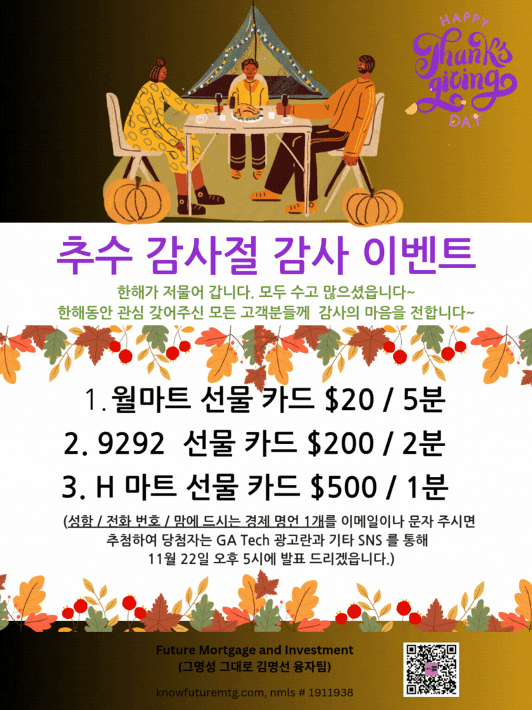 추수 감사절 감사 이벤트 (한해동안 관심 갖어주신 모든 고객분들께 감사의 마음을 전합니다~) 문자나 이메일로 신청하실 수 있읍니다 (성함, 전화번호, 아래 경제 명언 200개중에서 맘에 드시는 경제 명언 1개를 적어 주시면 됩니다. 문자: 770-242-3413 이메일: ask@knowfuturemtg.com Future Mortgage and Investment (그명성 그대로, 김명선 융자팀) ask@knowfuturemtg.com 770-242-3413 (Text first and Call) 770-679-8595 (Fax) 800-590-8580 (Text or Call) 돈을 벌기 위해서는 많은 것을 해야 하지만, 돈을 잃기 위해서는 아무것도 하지 않아도 됩니다. (빌리 그레이엄) https://www.youtube.com/watch?v=k8qvMk7znDY&list=PLwn_yFTCjWMUHPpnIRILgTvufURYBx_Xl&index=121 환기 사항 : 융자나 기타 서비스를 요청하지 않으며 누구나 무료로 신청하실 수 있읍니다. 개인정보는 절대적으로 보호되며, 선물 증정 추첨목적으로만 사용됩니다. 추첨 등록 마감일: 11월 21일 오후 11시 59분 (동부 시간)