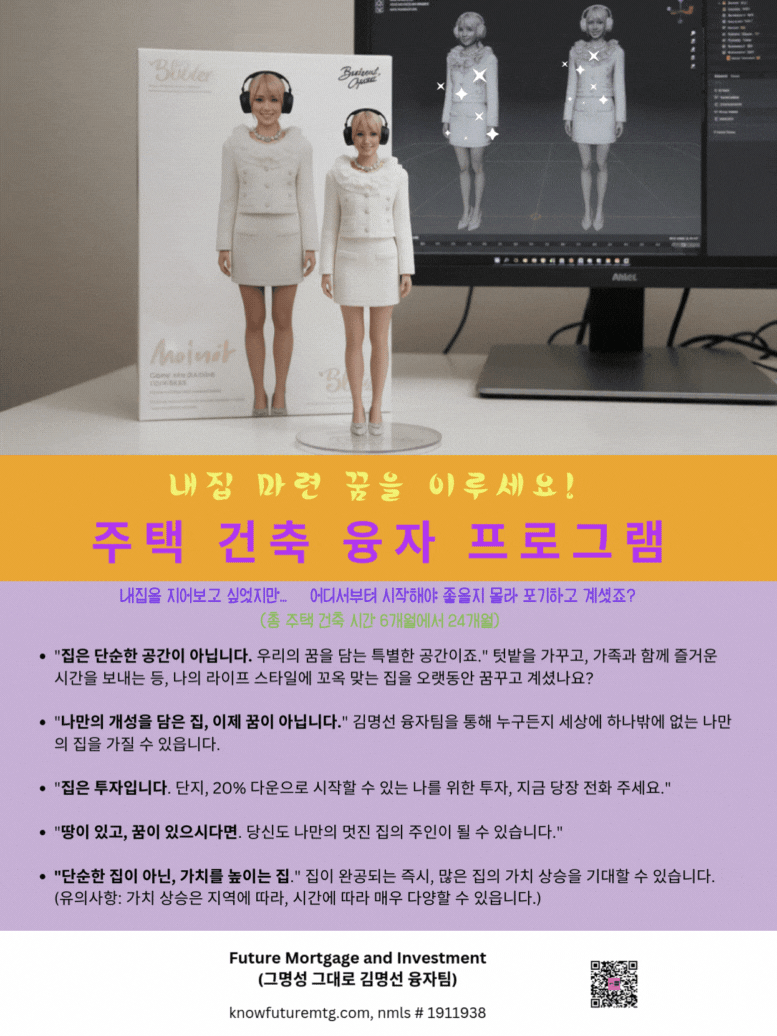 나도 주택 융자 받을 수 있을까요? 직접 확인해 보시고, 나에게 가능한 융자를 차곡차곡 준비해 보셔요~ 지금 당장 연락 주세요! 자세히 보러가기 (클릭하셔요): https://www.knowfuturemtg.com/landing-page2236c01c Future Mortgage and Investment (그명성 그대로, 김명선 융자팀) NMLS #1911938 ask@knowfuturemtg.com 770-242-3413 (Text first and Call) 770-679-8595 (Fax) 800-590-8580 (Text or Call) 주의 사항 1 : 융자는 돈 (신용)이고 돈 (신용) 은 빚입니다. 융자를 잘 활용하면 자산 증식이나 경제 생활에 큰 이익을 주지만, 그렇지 못할 경우, 집을 잃거나 경제적인 파국의 원인이 될 수 있읍니다. 육체적인 고통이나 정신적인 고통은 911을 누르시고, 채무로 인한 경제적인 고통은 CFPB, Financial Counselor 혹은 가까 운 융자 전문가에게 문의하셔요. 주의 사항 2: • 이 제안은 특정 대출 조건 및 자격 요건을 충족하는 고객에게만 해당됩니다. • 명시된 승인 시간 및 자금 수령 기간은 모든 경우에 적용되는 것은 아니며, 대출 금액, 지역, 서류 준비 상태 및 기타 조건에 따라 달라질 수 있습니다. • 모든 대출은 최종 심사 및 승인 절차를 거쳐서 최종 융자 승인이나 융자 거부가 될 수 있읍니다. • 모든 이자율 및 수수료와 페이먼트는 시장 상황에 따라 변동될 수 있으며, 최종 이자율은 융자 신청이후 Lock 시점에 결정됩니다. 주의사항 3: 추수 감사절과 크리스마스 연말연휴로 인해서 융자 진행이 개인과 상황에 따라서 지연될 수 있읍니 다. 모델: AI 도우미, 소피아 978-788-1544 ( 24시간, 365일 통화 가능합니다)
