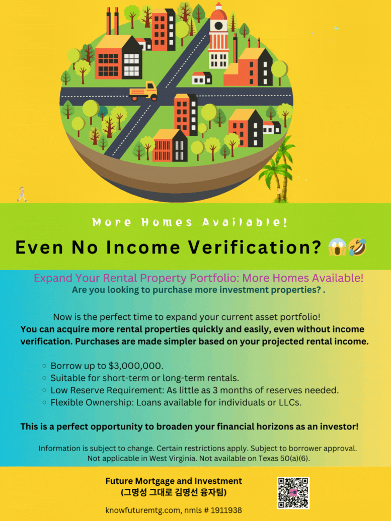 ❤❣💟💛💌💯 수입 증명 없이 주택 구입 가능할까요? 더 많은 투자용 부동산을 구입하고 싶으신가요? ❤❣💟💛💌💯 지금이 바로 현재 갖고 계신 자산목록 (포트폴리오)를 확장하실 기회입니다. 투자용 주택 융자 신청하기 (클릭하셔요~) ❤❣💟💛💌💯 Future Mortgage and Investment (그명성 그대로, 김명선 융자팀) ask@knowfuturemtg.com 770-242-3413 (Text first and Call) 770-679-8595 (Fax) 800-590-8580 (Text or Call) ❤❣💟💛💌💯 주의 1: • 이 제안은 특정 대출 조건 및 자격 요건을 충족하는 고객에게만 해당됩니다. • 명시된 승인 시간 및 자금 수령 기간은 모든 경우에 적용되는 것은 아니며, 대출 금액, 지역, 서류 준비 상태 및 기타 조건에 따라 달라질 수 있습니다. • 모든 대출은 최종 심사 및 승인 절차를 거쳐야 합니다. • 모든 이자율 및 수수료는 시장 상황에 따라 변동될 수 있으며, 최종 금리는 신청 시점에 결정됩니다. 주의2: Information is subject to change. Certain restrictions apply. Subject to borrower approval. Not applicable in West Virginia. Not available on Texas 50(a)(6). 주의 3: 융자는 돈 (신용)이고 돈 (신용) 은 빚입니다. 융자를 잘 활용하면 자산 증식이나 경제 생활에 큰 이익을 주지만, 그렇지 못할 경우, 집을 잃거나 경제적인 파국의 원인이 될 수 있읍니다. 육체적인 고통이나 정신적인 고통은 911을 누르시고, 채무로 인한 경제적인 고통은 CFPB, Financial Counselor 혹은 가까운 융자 전문가에게 문의하셔요.