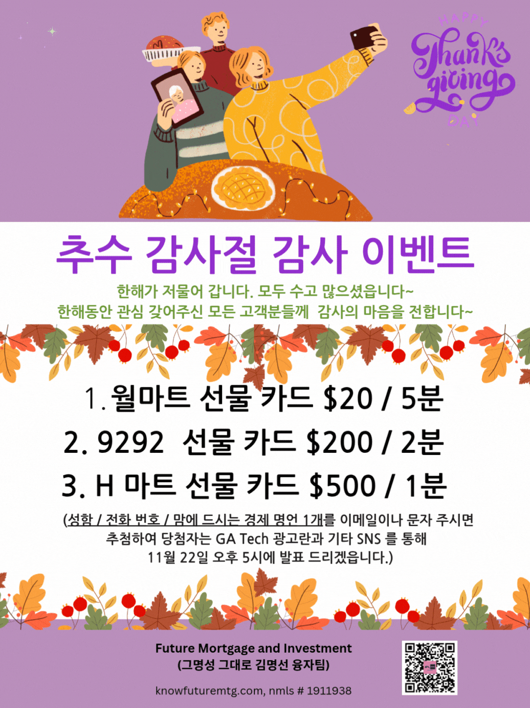 추수 감사절 감사 이벤트 (한해동안 관심 갖어주신 모든 고객분들께 감사의 마음을 전합니다~) 문자나 이메일로 신청하실 수 있읍니다 (성함, 전화번호, 아래 경제 명언 200개중에서 맘에 드시는 경제 명언 1개를 적어 주시면 됩니다. 문자: 770-242-3413 이메일: ask@knowfuturemtg.com Future Mortgage and Investment (그명성 그대로, 김명선 융자팀) ask@knowfuturemtg.com 770-242-3413 (Text first and Call) 770-679-8595 (Fax) 800-590-8580 (Text or Call) 돈을 벌기 위해서는 많은 것을 해야 하지만, 돈을 잃기 위해서는 아무것도 하지 않아도 됩니다. (빌리 그레이엄) https://www.youtube.com/watch?v=k8qvMk7znDY&list=PLwn_yFTCjWMUHPpnIRILgTvufURYBx_Xl&index=121 환기 사항 : 융자나 기타 서비스를 요청하지 않으며 누구나 무료로 신청하실 수 있읍니다. 개인정보는 절대적으로 보호되며, 선물 증정 추첨목적으로만 사용됩니다. 추첨 등록 마감일: 11월 21일 오후 11시 59분 (동부 시간)