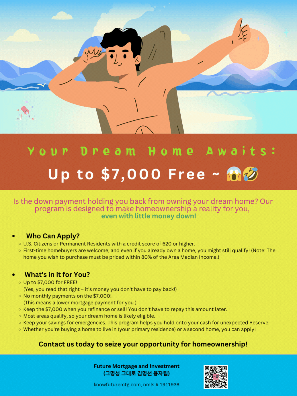 나도 주택 융자 받을 수 있을까요? 직접 확인해 보시고, 나에게 가능한 융자를 차곡차곡 준비해 보셔요~ 지금 당장 연락 주세요! 자세히 보러가기 (클릭하셔요): https://www.knowfuturemtg.com/landing-page2236c01c Future Mortgage and Investment (그명성 그대로, 김명선 융자팀) NMLS #1911938 ask@knowfuturemtg.com 770-242-3413 (Text first and Call) 770-679-8595 (Fax) 800-590-8580 (Text or Call) 주의 사항 1 : 융자는 돈 (신용)이고 돈 (신용) 은 빚입니다. 융자를 잘 활용하면 자산 증식이나 경제 생활에 큰 이익을 주지만, 그렇지 못할 경우, 집을 잃거나 경제적인 파국의 원인이 될 수 있읍니다. 육체적인 고통이나 정신적인 고통은 911을 누르시고, 채무로 인한 경제적인 고통은 CFPB, Financial Counselor 혹은 가까 운 융자 전문가에게 문의하셔요. 주의 사항 2: • 이 제안은 특정 대출 조건 및 자격 요건을 충족하는 고객에게만 해당됩니다. • 명시된 승인 시간 및 자금 수령 기간은 모든 경우에 적용되는 것은 아니며, 대출 금액, 지역, 서류 준비 상태 및 기타 조건에 따라 달라질 수 있습니다. • 모든 대출은 최종 심사 및 승인 절차를 거쳐서 최종 융자 승인이나 융자 거부가 될 수 있읍니다. • 모든 이자율 및 수수료와 페이먼트는 시장 상황에 따라 변동될 수 있으며, 최종 이자율은 융자 신청이후 Lock 시점에 결정됩니다. 주의사항 3: 추수 감사절과 크리스마스 연말연휴로 인해서 융자 진행이 개인과 상황에 따라서 지연될 수 있읍니 다. 모델: AI 도우미, 소피아 978-788-1544 ( 24시간, 365일 통화 가능합니다)