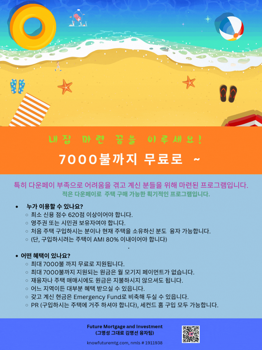 1%만 다운하시고 최고 $7,000까지 무료로 다운 페이먼트 보조해 드립니다.