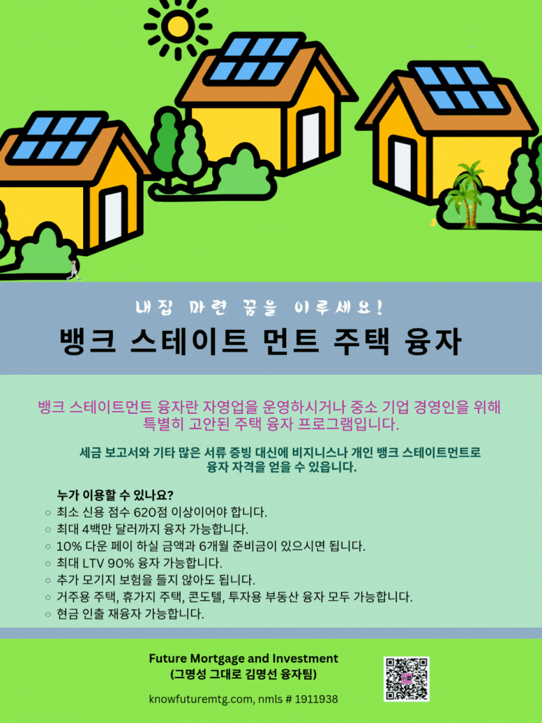 ❤❣💟💛💌💯 수입 증명 없이 주택 구입 가능할까요? 더 많은 투자용 부동산을 구입하고 싶으신가요? ❤❣💟💛💌💯 지금이 바로 현재 갖고 계신 자산목록 (포트폴리오)를 확장하실 기회입니다. 투자용 주택 융자 신청하기 (클릭하셔요~) ❤❣💟💛💌💯 Future Mortgage and Investment (그명성 그대로, 김명선 융자팀) ask@knowfuturemtg.com 770-242-3413 (Text first and Call) 770-679-8595 (Fax) 800-590-8580 (Text or Call) ❤❣💟💛💌💯 주의 1: • 이 제안은 특정 대출 조건 및 자격 요건을 충족하는 고객에게만 해당됩니다. • 명시된 승인 시간 및 자금 수령 기간은 모든 경우에 적용되는 것은 아니며, 대출 금액, 지역, 서류 준비 상태 및 기타 조건에 따라 달라질 수 있습니다. • 모든 대출은 최종 심사 및 승인 절차를 거쳐야 합니다. • 모든 이자율 및 수수료는 시장 상황에 따라 변동될 수 있으며, 최종 금리는 신청 시점에 결정됩니다. 주의2: Information is subject to change. Certain restrictions apply. Subject to borrower approval. Not applicable in West Virginia. Not available on Texas 50(a)(6). 주의 3: 융자는 돈 (신용)이고 돈 (신용) 은 빚입니다. 융자를 잘 활용하면 자산 증식이나 경제 생활에 큰 이익을 주지만, 그렇지 못할 경우, 집을 잃거나 경제적인 파국의 원인이 될 수 있읍니다. 육체적인 고통이나 정신적인 고통은 911을 누르시고, 채무로 인한 경제적인 고통은 CFPB, Financial Counselor 혹은 가까운 융자 전문가에게 문의하셔요.