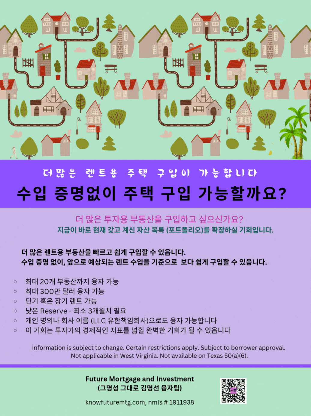 ❤❣💟💛💌💯 수입 증명 없이 주택 구입 가능할까요? 더 많은 투자용 부동산을 구입하고 싶으신가요? ❤❣💟💛💌💯 지금이 바로 현재 갖고 계신 자산목록 (포트폴리오)를 확장하실 기회입니다. 투자용 주택 융자 신청하기 (클릭하셔요~) ❤❣💟💛💌💯 Future Mortgage and Investment (그명성 그대로, 김명선 융자팀) ask@knowfuturemtg.com 770-242-3413 (Text first and Call) 770-679-8595 (Fax) 800-590-8580 (Text or Call) ❤❣💟💛💌💯 주의 1: • 이 제안은 특정 대출 조건 및 자격 요건을 충족하는 고객에게만 해당됩니다. • 명시된 승인 시간 및 자금 수령 기간은 모든 경우에 적용되는 것은 아니며, 대출 금액, 지역, 서류 준비 상태 및 기타 조건에 따라 달라질 수 있습니다. • 모든 대출은 최종 심사 및 승인 절차를 거쳐야 합니다. • 모든 이자율 및 수수료는 시장 상황에 따라 변동될 수 있으며, 최종 금리는 신청 시점에 결정됩니다. 주의2: Information is subject to change. Certain restrictions apply. Subject to borrower approval. Not applicable in West Virginia. Not available on Texas 50(a)(6). 주의 3: 융자는 돈 (신용)이고 돈 (신용) 은 빚입니다. 융자를 잘 활용하면 자산 증식이나 경제 생활에 큰 이익을 주지만, 그렇지 못할 경우, 집을 잃거나 경제적인 파국의 원인이 될 수 있읍니다. 육체적인 고통이나 정신적인 고통은 911을 누르시고, 채무로 인한 경제적인 고통은 CFPB, Financial Counselor 혹은 가까운 융자 전문가에게 문의하셔요.