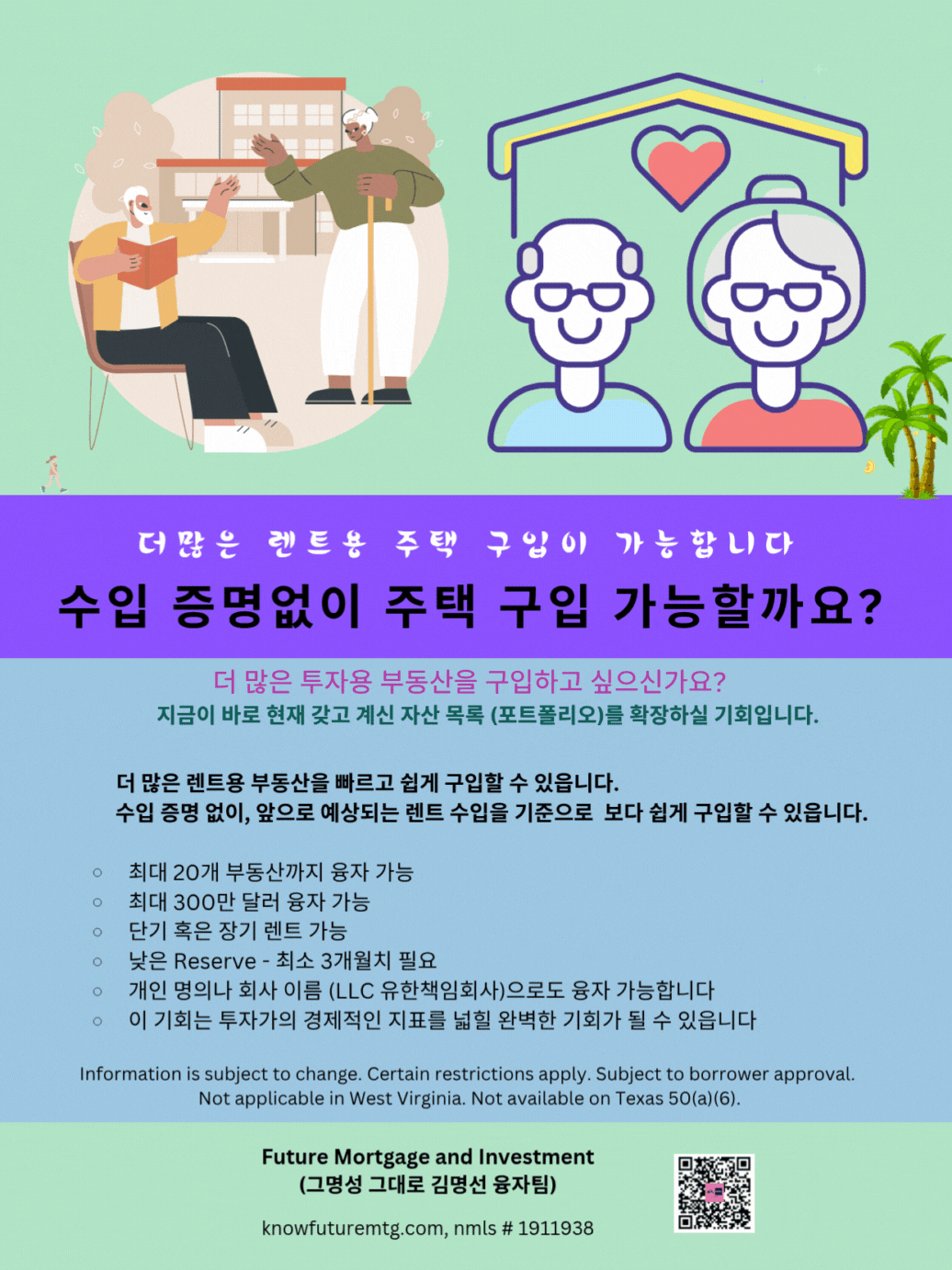 ❤❣💟💛💌💯 수입 증명 없이 주택 구입 가능할까요? 더 많은 투자용 부동산을 구입하고 싶으신가요? ❤❣💟💛💌💯 지금이 바로 현재 갖고 계신 자산목록 (포트폴리오)를 확장하실 기회입니다. 투자용 주택 융자 신청하기 (클릭하셔요~) ❤❣💟💛💌💯 Future Mortgage and Investment (그명성 그대로, 김명선 융자팀) ask@knowfuturemtg.com 770-242-3413 (Text first and Call) 770-679-8595 (Fax) 800-590-8580 (Text or Call) ❤❣💟💛💌💯 주의 1: • 이 제안은 특정 대출 조건 및 자격 요건을 충족하는 고객에게만 해당됩니다. • 명시된 승인 시간 및 자금 수령 기간은 모든 경우에 적용되는 것은 아니며, 대출 금액, 지역, 서류 준비 상태 및 기타 조건에 따라 달라질 수 있습니다. • 모든 대출은 최종 심사 및 승인 절차를 거쳐야 합니다. • 모든 이자율 및 수수료는 시장 상황에 따라 변동될 수 있으며, 최종 금리는 신청 시점에 결정됩니다. 주의2: Information is subject to change. Certain restrictions apply. Subject to borrower approval. Not applicable in West Virginia. Not available on Texas 50(a)(6). 주의 3: 융자는 돈 (신용)이고 돈 (신용) 은 빚입니다. 융자를 잘 활용하면 자산 증식이나 경제 생활에 큰 이익을 주지만, 그렇지 못할 경우, 집을 잃거나 경제적인 파국의 원인이 될 수 있읍니다. 육체적인 고통이나 정신적인 고통은 911을 누르시고, 채무로 인한 경제적인 고통은 CFPB, Financial Counselor 혹은 가까운 융자 전문가에게 문의하셔요.