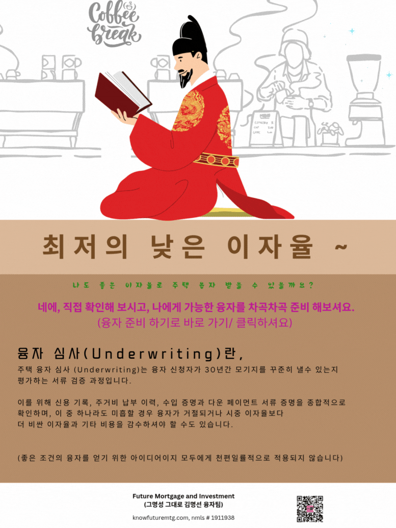 오늘 이자율이 궁금하신가요? 직접 확인해 보셔요~~~ (클릭하셔요) https://www.knowfuturemtg.com/landing-page2236c01c Future Mortgage and Investment (그명성 그대로, 김명선 융자팀) ask@knowfuturemtg.com 770-242-3413 ( Text first and Call) 770-679-8595 (Fax) 800-590-8580 (Text or Call) 주의 사항 1: 융자는 돈 (신용)이고 돈 (신용) 은 빚입니다. 융자를 잘 활용하면 자산 증식이나 경제 생활에 큰 이익을 주지만, 그렇지 못할 경우, 집을 잃거나 경제적인 파국의 원인이 될 수 있읍니다. 육체적인 고통이나 정신적인 고통은 911을 누르시고, 채무로 인한 경제적인 고통은 CFPB, Financial Counselor 혹은 가까운 융자 전문가에게 문의하셔요. 주의 사항 2: • 이 제안은 특정 대출 조건 및 자격 요건을 충족하는 고객에게만 해당됩니다. • 명시된 승인 시간 및 자금 수령 기간은 모든 경우에 적용되는 것은 아니며, 대출 금액, 지역, 서류 준비 상태 및 기타 조건에 따라 달라질 수 있습니다. • 모든 대출은 최종 심사 및 승인 절차를 거쳐서 최종 융자 승인이나 융자 거부가 될 수 있읍니다. • 모든 이자율 및 수수료와 페이먼트는 시장 상황에 따라 변동될 수 있으며, 최종 이자율은 융자 신청이후 Lock 시점에 결정됩니다. 주의사항 3: 추수 감사절과 크리스마스 연말연휴로 인해서 융자 진행이 개인과 상황에 따라서 지연될 수 있읍니 다. 모델: AI 도우미, 소피아 978-788-1544 (24시간, 365일 통화 가능합니다)