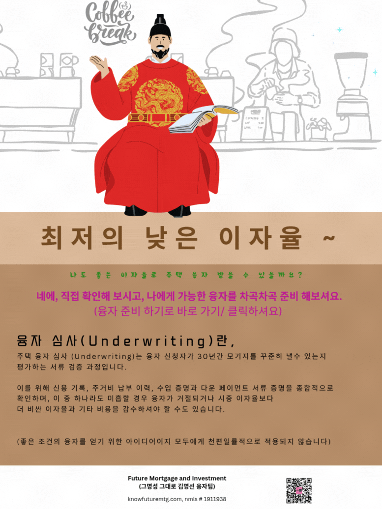 오늘 이자율이 궁금하신가요? 직접 확인해 보셔요~~~ (클릭하셔요) https://www.knowfuturemtg.com/landing-page2236c01c Future Mortgage and Investment (그명성 그대로, 김명선 융자팀) ask@knowfuturemtg.com 770-242-3413 ( Text first and Call) 770-679-8595 (Fax) 800-590-8580 (Text or Call) 주의 사항 1: 융자는 돈 (신용)이고 돈 (신용) 은 빚입니다. 융자를 잘 활용하면 자산 증식이나 경제 생활에 큰 이익을 주지만, 그렇지 못할 경우, 집을 잃거나 경제적인 파국의 원인이 될 수 있읍니다. 육체적인 고통이나 정신적인 고통은 911을 누르시고, 채무로 인한 경제적인 고통은 CFPB, Financial Counselor 혹은 가까운 융자 전문가에게 문의하셔요. 주의 사항 2: • 이 제안은 특정 대출 조건 및 자격 요건을 충족하는 고객에게만 해당됩니다. • 명시된 승인 시간 및 자금 수령 기간은 모든 경우에 적용되는 것은 아니며, 대출 금액, 지역, 서류 준비 상태 및 기타 조건에 따라 달라질 수 있습니다. • 모든 대출은 최종 심사 및 승인 절차를 거쳐서 최종 융자 승인이나 융자 거부가 될 수 있읍니다. • 모든 이자율 및 수수료와 페이먼트는 시장 상황에 따라 변동될 수 있으며, 최종 이자율은 융자 신청이후 Lock 시점에 결정됩니다. 주의사항 3: 추수 감사절과 크리스마스 연말연휴로 인해서 융자 진행이 개인과 상황에 따라서 지연될 수 있읍니 다. 모델: AI 도우미, 소피아 978-788-1544 (24시간, 365일 통화 가능합니다)